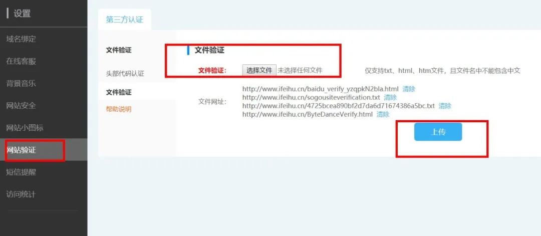 第四步:把下载的验证文件上传至我们后台的网站文件验证(设置-网站验证)
