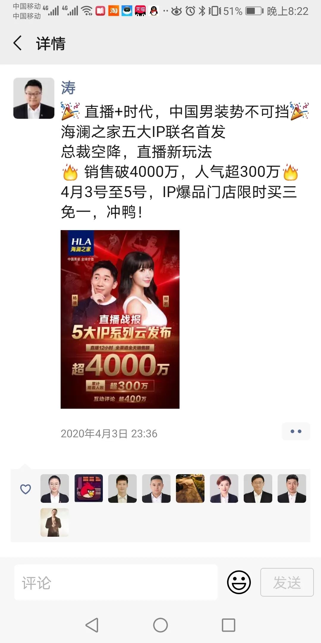 “ 一年逛两次海澜之家,每次都有新感觉。 这句广告词熟吗?即使现在海澜之家的新广告已经变了风格,相信你也对那个「男人的衣柜」印象深刻。 如今,海澜之家的线上商城有更丰富选择和体验,你一年很可能不止逛“两次”海澜之家了。在小程序,一分钟内你就可以完成逛街、挑选、付款、离店等系列操作。 你甚至可以在小程序上独自看一场明星、总裁亲临的新品发布会。 柳岩、杨迪+总裁打“声量”,员工打“私域” 马拉松式直播收获300+万观看量 4 月 3 日,海澜之家在自己的小程序商城里开启了一场全天候的「马拉松式直播」。整场直播耗时 12 小时,直播间就没停下来过。中场总裁出场,开启 1 元秒杀,晚上明星上阵,杨迪、柳岩开始做产品介绍。 这场直播最终获得了 300 多万的观看数,78.4 万的评论,整个直播间异常活跃。 这不是海澜之家的第一次直播,但把新品发布放到小程序直播间还是第一次。因为小程序直播的内容更能代表品牌官方,且直播间承载了新品发布的属性,这些都和其他平台直播常有的“去库存”目的不同,因此小程序直播值得更高的配置,既有总裁,也有明星上场带货。 海澜之家的总裁周立宸认为,新品直播就是需要一鼓作气。 “ 明星是能让进直播间的非海澜之家粉丝做更多的停留。我的参与只是点缀,让我们的员工更有动力、更有凝聚力,因为所有的「私域」都是由员工来发动的。 私域流量由员工来发动,这就是海澜之家前期做的准备工作之一。 引入了奖金奖励,海澜之家对所有的终端门店的员工进行了运营和部署。在奖金的刺激下,品牌全国门店的员工都加入进了宣传队伍中,把自己朋友圈、群聊及日常销售中留存的客户资源输送到直播间。 “ 这其实也是花钱买流量,只是这个流量成本更低,同时被「买」进直播间的流量基本就是自己的目标用户,用户更精准,转化也更加有效。 除了员工引流,品牌也有尝试平台引流。在朋友圈、公众号购买一些广告进行投放,宣传即将开始的小程序直播也是品牌的选择。 不过在用户启动上,盘活老用户一直是海澜之家的重点。 经过两年的运营,海澜之家在微信上有了 900 多万的粉丝。在此次直播开始前,海澜之家也在公众号上发布了自己的直播信息。10 点直播开始,同一时间公众号文章预告启动。首先预告当天最重磅的新品发布时间,同时用红包狂撒、1 元秒杀这样的活动吸引用户进入直播间。 尽管在用户进入直播间时新品发布还未开始,但当时已有特定的主播在进行直播,销售特定的商品了。引导用户登录、订阅、提醒都更加容易。 在这个 300 多万人观看的直播中,微信内分享、自定义菜单,扫码识别,微信公众号,和不同平台的引流都给直播间带来了不少的流量。 小程序直播就像社群运营 企业出货新选择 海澜之家从去年开始就在做直播,但小程序平台和其他直播间的逻辑并不相同。平台导流的公域流量,本身就有固定客群的直播间 KOL,销售分成和花钱直播都和小程序直播不同。 海澜之家认为,小程序直播也可以有公域流量,但那需要由朋友圈和公众号广告进行导流。想在小程序里进行直播,更高效低成本的办法是用微信现有的工具进行引流。这 300 多万的观看人数也基本都由品牌自己吸引导入,可以说是从头到尾都属于自己的直播间。 现在各个品牌都在利用直播进行销售。在疫情之中,直播甚至成了诸多线下品牌的自救之法。诸多总裁亲自直播,「柜姐」也变成了主播。海澜之家也是这些品牌的一员,并且他们认为,即便疫情过去,小程序直播的形式也会常态化。 在周立宸看来,小程序直播和社群有些类似,也可以看作一种私域流量。他认为直播和社区的本质是一样的,都是企业出货的一种选择。 “ 社群是把人圈在一个群里面去做生意,直播是把人圈到了直播间来做生意。所以,用微信的直播本质就是把大家拉到一个群里面、拉到一个直播间里面,然后通过群和直播间里面的活动、亮点的吸引用户进行成交。 打好“基本盘” 才能做好长期运营准备 2018 年年底,海澜之家开始和腾讯智慧零售团队进行了合作。此后动作频频,千万红包、情意绵绵袜的裂变活动,爱居兔的「导购」运营模式,都在微信生态运营进行了更多尝试。 海澜之家在微信的 900 多万粉丝中,300 万来自一个简单送袜子的活动引流。这些粉丝从线下门店而来,从不同的运营活动中来,最终成为海澜之家其他微信活动中的「基本盘」。这些工具和流量也成为海澜之家进行数字化转型的关键。 线下给线上引流,线上同时也在给线下引流。在海澜之家的体系中,整个商城能联动线上和线下,导购能为线上服务,运营也能为线下服务。 线上小程序直播产生的订单也能被分配到线下,由线下进行更为高效的发货配送,线上的小程序直播也可能成为线下门店的一种获客方式。 海澜之家认为,直播未来会有常态化的趋势,直播能够沉淀粉丝并促成销售。 有了这个前提,他们开始优化直播内容,希望娱乐化的内容不会让粉丝产生疲劳甚至流失;也开始思考如何在直播间给出更大的利益和玩法,促进用户的转发分享。在小程序直播里,这都是未来要探索的内容。 但一切也不止小程序直播。在海澜之家看来,直播是一种形式,社群是一种形式,怎样裂变也是一种形式,不拘泥于使用哪种形式,触达到消费者就是成功。 “ 在微信这个池子里,公