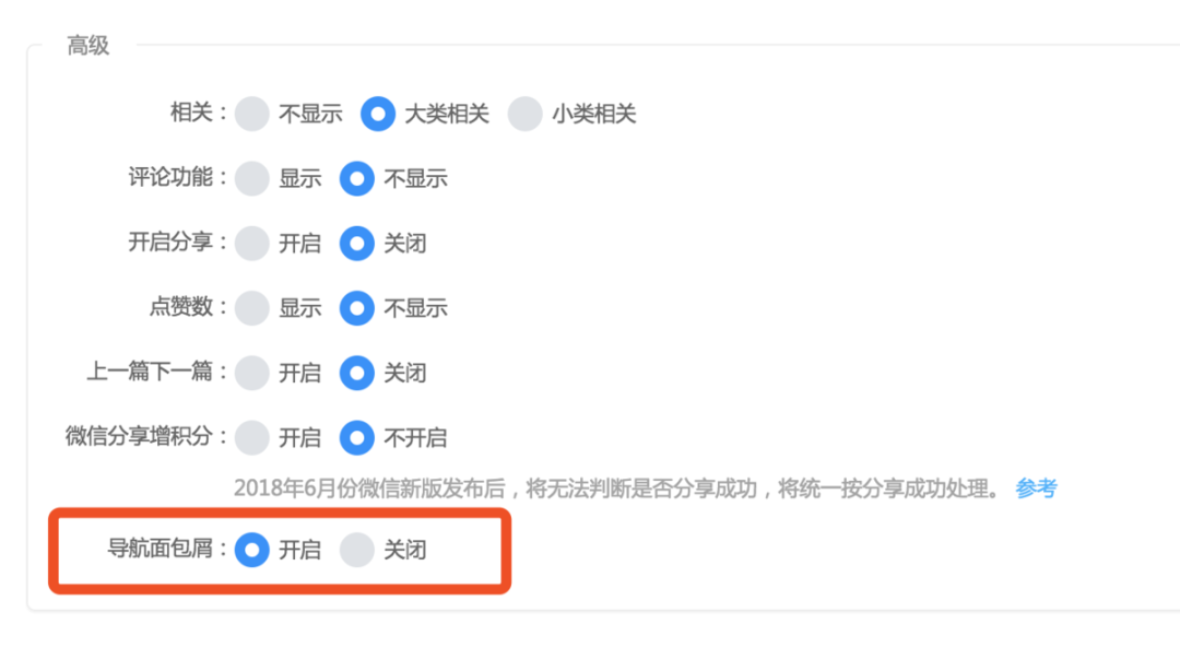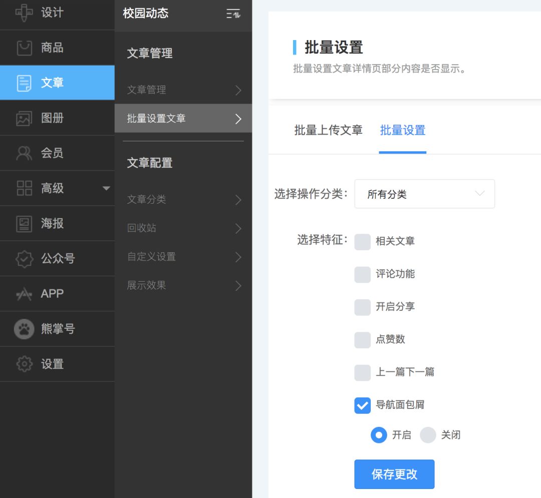 2、批量设置文章导航面包屑、相关文章、评论功能、开启分享、点赞数、上一篇下一篇等是否显示(想批量设置哪一项就勾选哪一项)