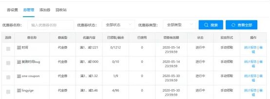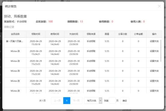 (2) 统计报告:也是会员领取记录表,可设置某个会员领取的某张优惠券失效,失效后不能下单使用。