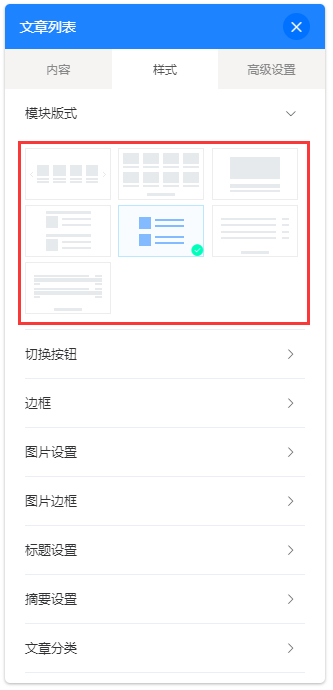 每一项内容都支持独立的开启关闭和样式设置如:图片大小尺寸,内容摘要,分类,发布时间,查看人数等样式都支持非常丰富的自定义设计